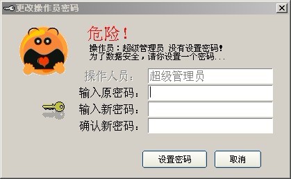 11、如果超级管理员的密码为空,软件将会提示您参加一个新的密码,以保证系统不容易被其他人登录,如果您认为试用的数据不重要,可以点击“取消”跳过。超级管理员是软件里面的最高管理权限,请务必牢记该密码,如果忘记密码,必须提供加密锁编号和企业信息给我们确认,方可获得解码服务。