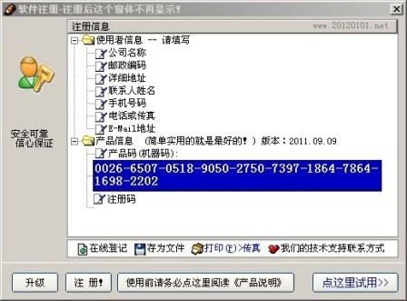5、运行软件后,试用版会出现注册窗口。“点这里试用”即可进入下一步的操作。试用的规定时间是2个月,实际时间,可能长或短些,如果不够时间,可以联系我解密一下就可以了。试用软件注册后就是正式版,数据可以继续使用,正式版不再显示注册窗口。