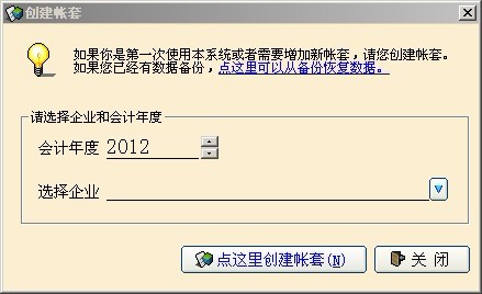 6、第一次使用软件,需要“点这里创建帐套”创建一个帐套,这个帐套将来就是保存该企业的所有财务数据的。