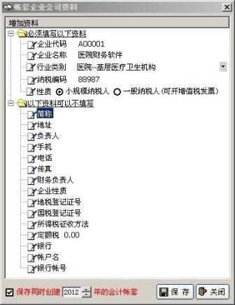 7、必填项的数据必须填写,但不要求是否真实。正式用户建议真实完整填写,因为以后报表会用到这里的数据,不填也没关系。如果需要创建其它年份的帐套,请调整“保存”按钮左边的年度。